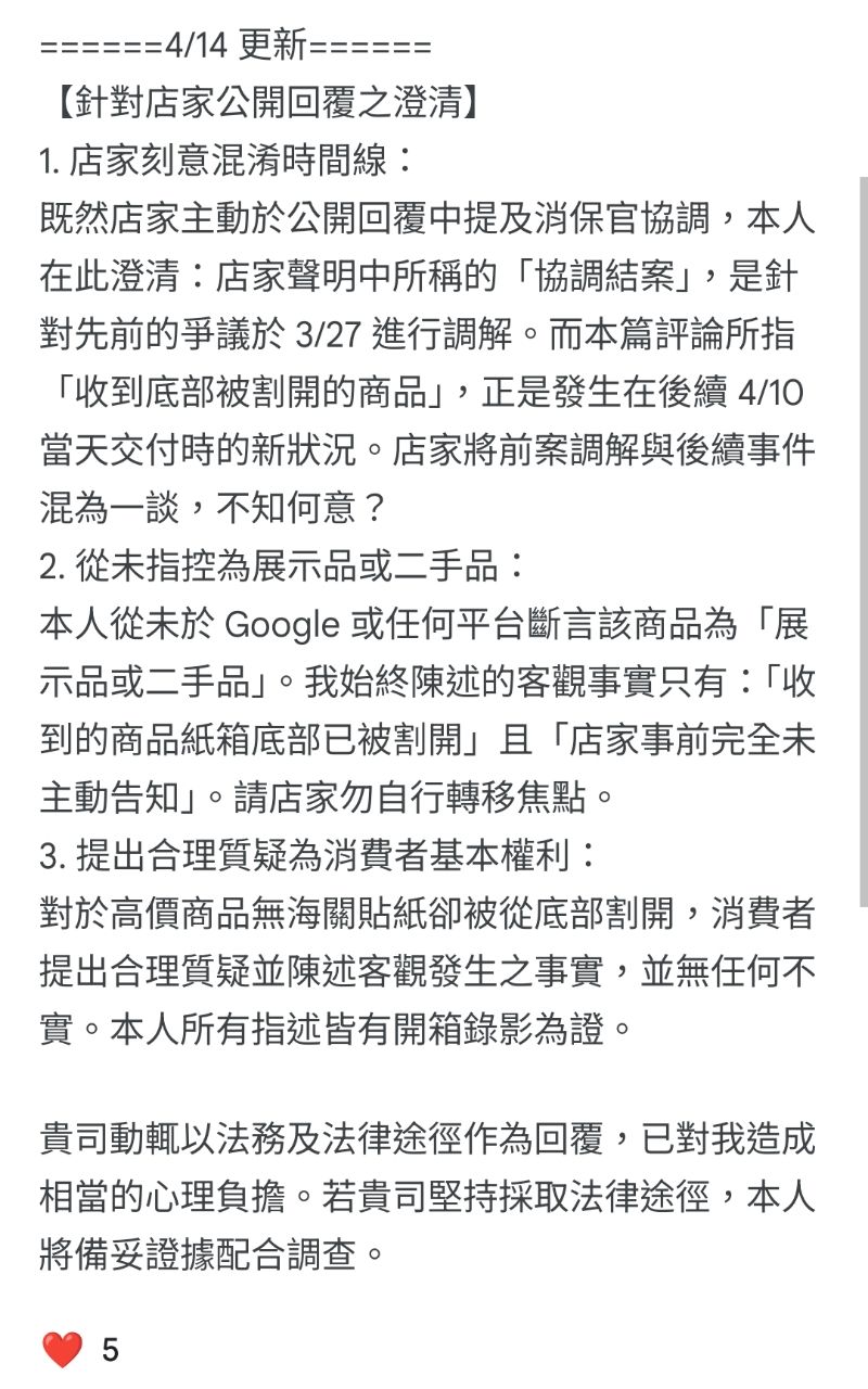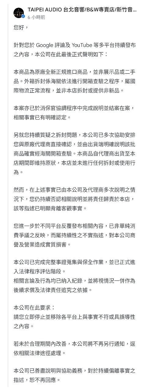 店家在回覆裡提到正在對 YouTube 等平台的留言截圖蒐證。如果有版友剛好有去 YouTub