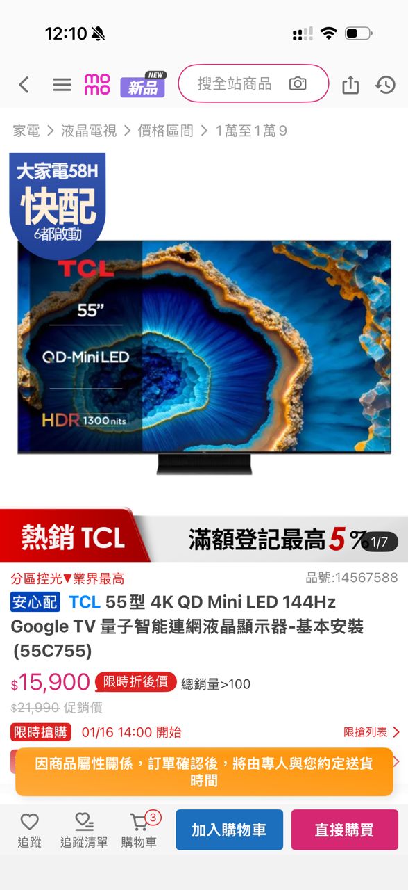 [情報] momo TCL 55C755 15,900