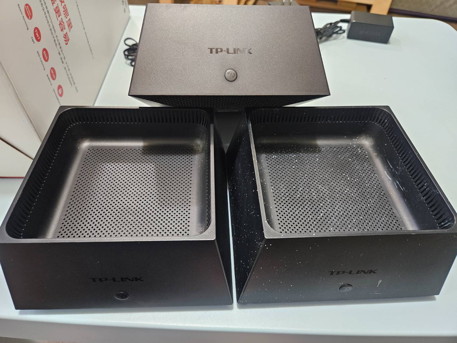 其中一台子路由被油漆噴到但不影響功能, 配件如照片所示