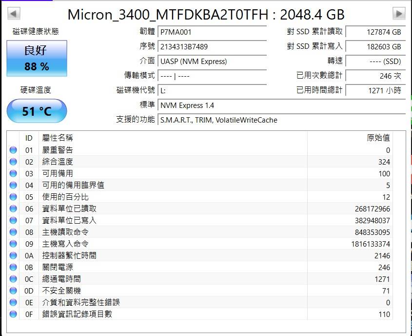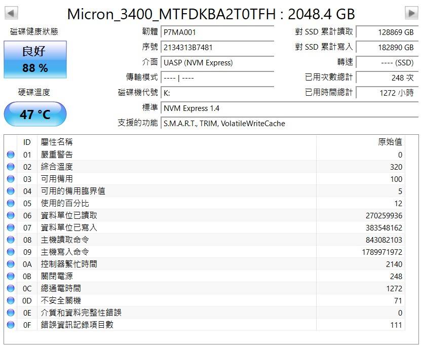 1. 美光 3400 2TB 健康度88% * 2