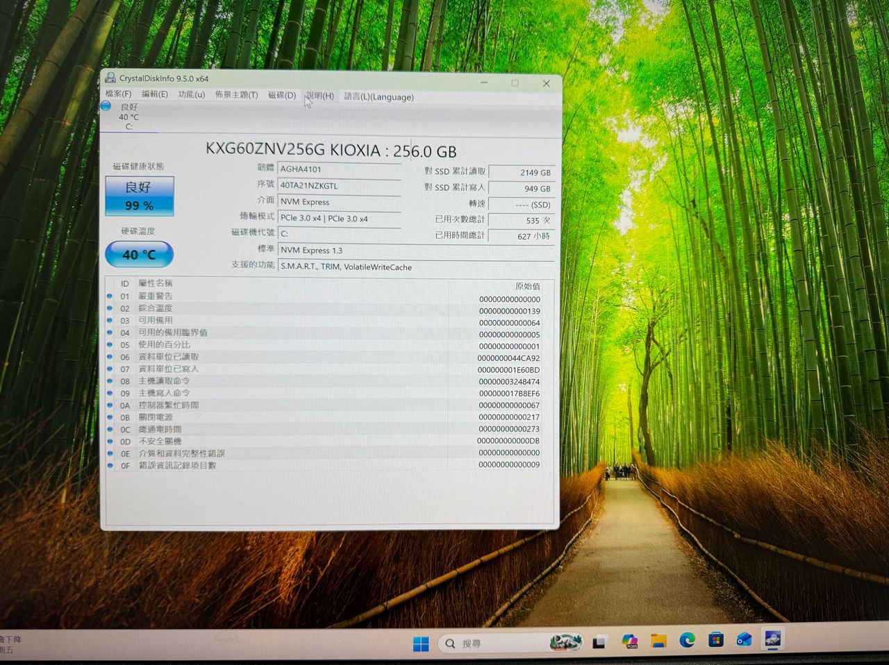 硬碟:KIOXIA 256G (M.2) 健康度99% 使用627小時