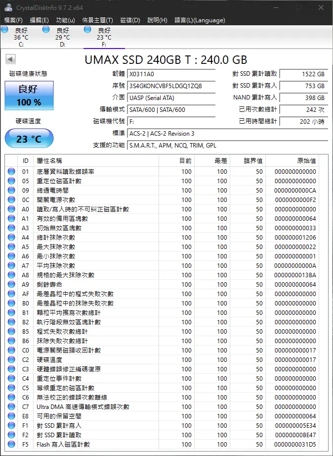 ◎硬體型號: UMAX S330 240GB SSD兩顆