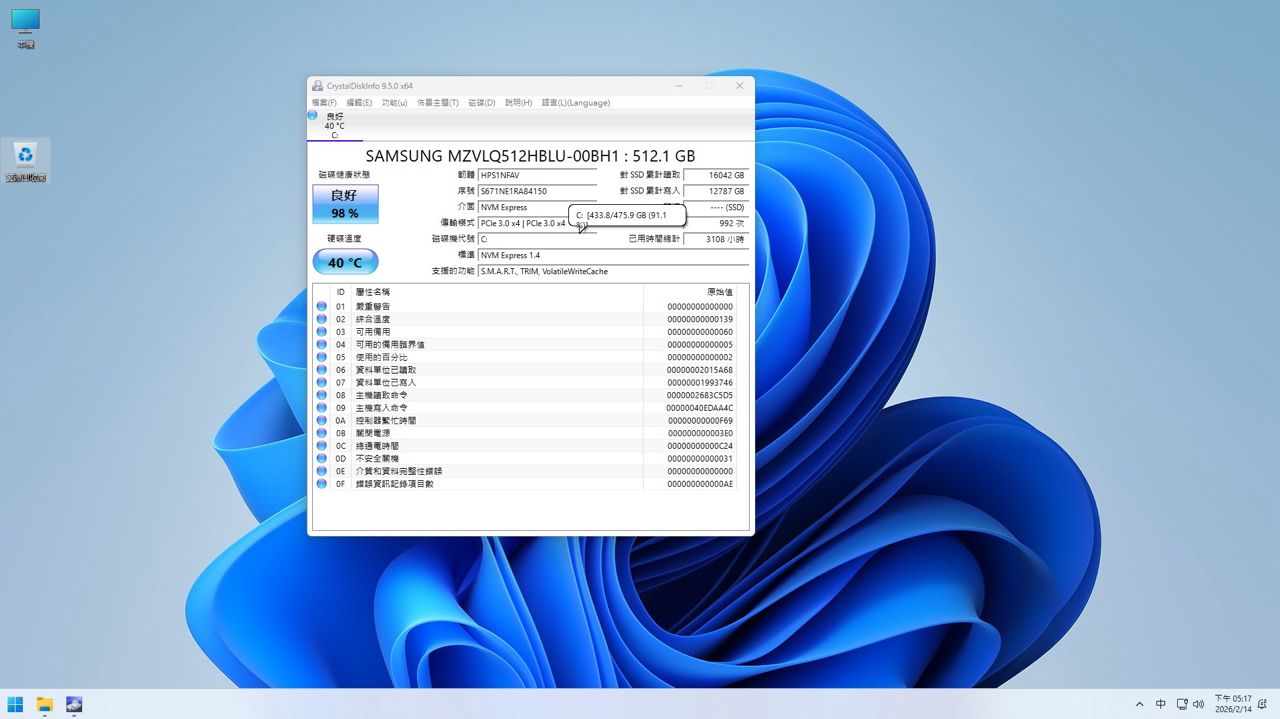 硬碟:三星m2.ssd 512G (健康度98%)
