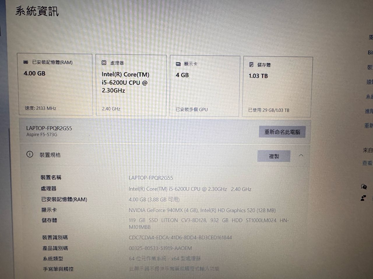 ◎硬體型號: 筆電15.6吋 Acer Aspire F 15 F5-573g i5 6200u ssd 128g +hdd 1000G