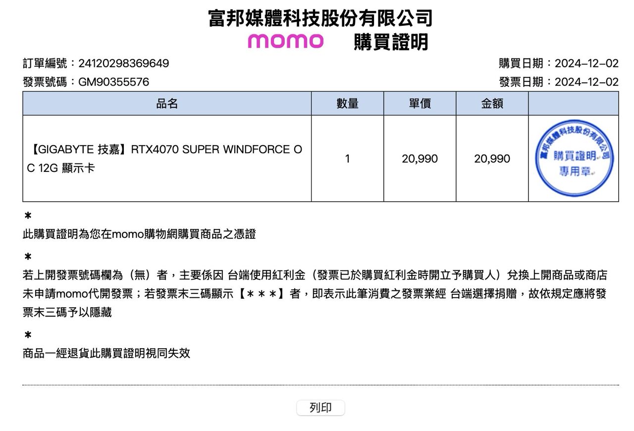 ◎硬體型號: gigabyte windforce oc 12g 4070 super