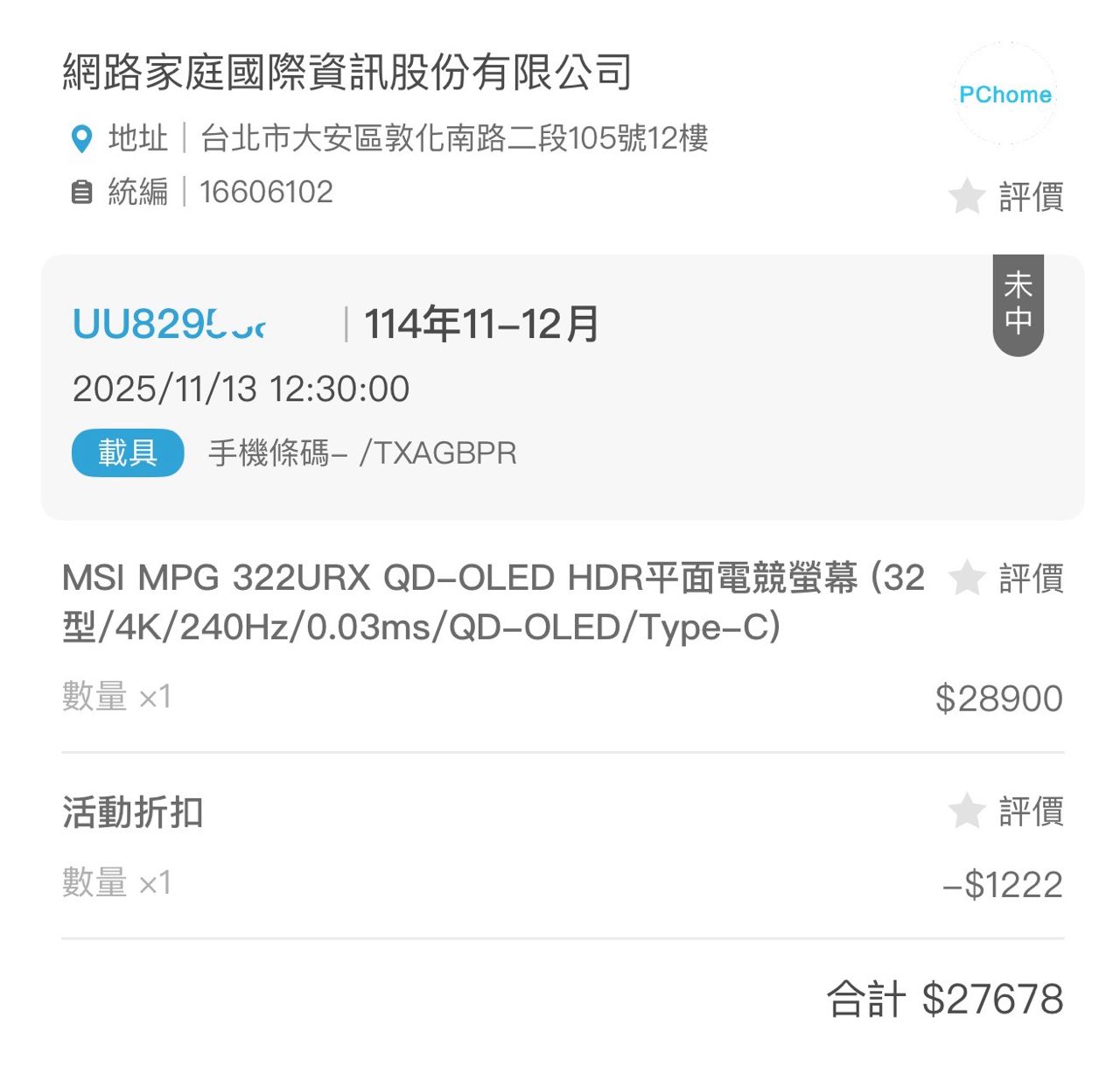 ◎品樣狀況: 2025/11/15 Pchome出貨購入 極新