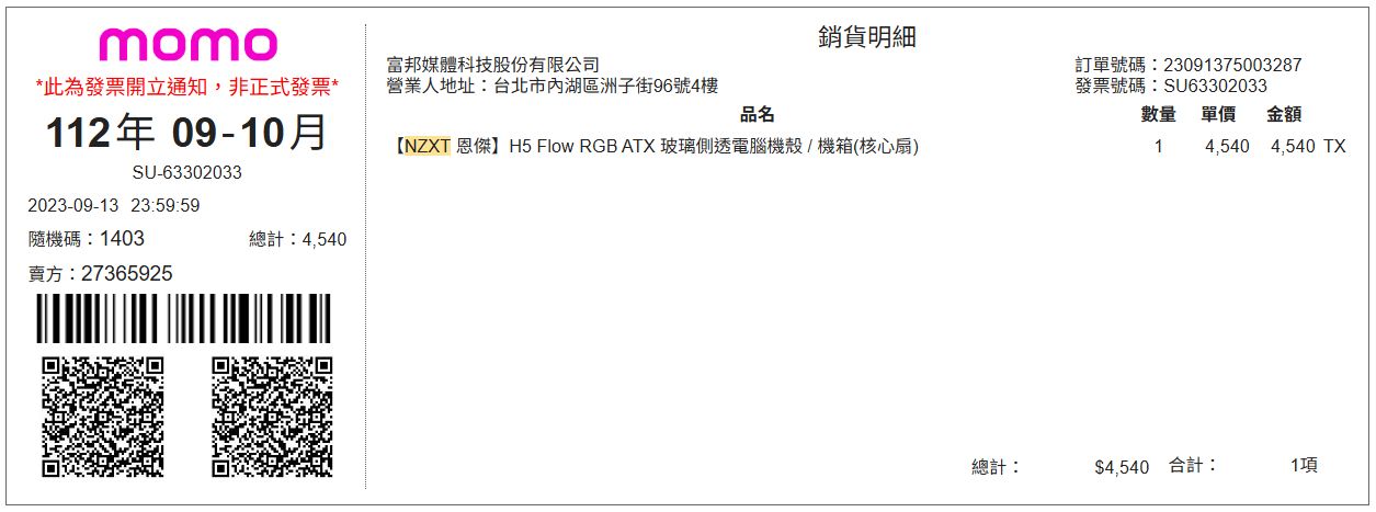 機殼:NZXT H5 Flow RGB ATX 玻璃側透電腦機殼 2023/9/13MOMO,過保。
