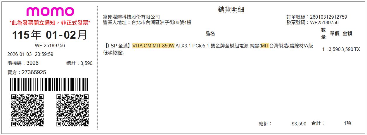 電源:全漢 VITA GM MIT 850W ATX3.1 PCle5.1雙金牌全模組電源 黑色 2026/1/3MOMO,