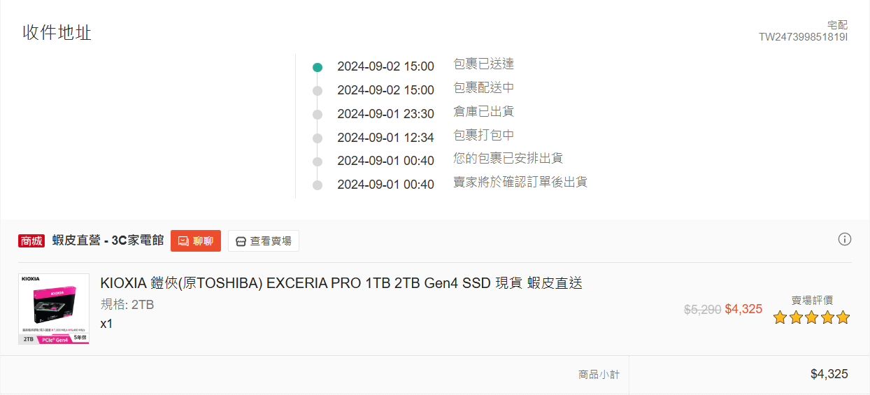 SSD:鎧俠EXCERIA PRO 2TB Gen4 SSD 2024/9/1蝦皮直營,保內2029/9/1。