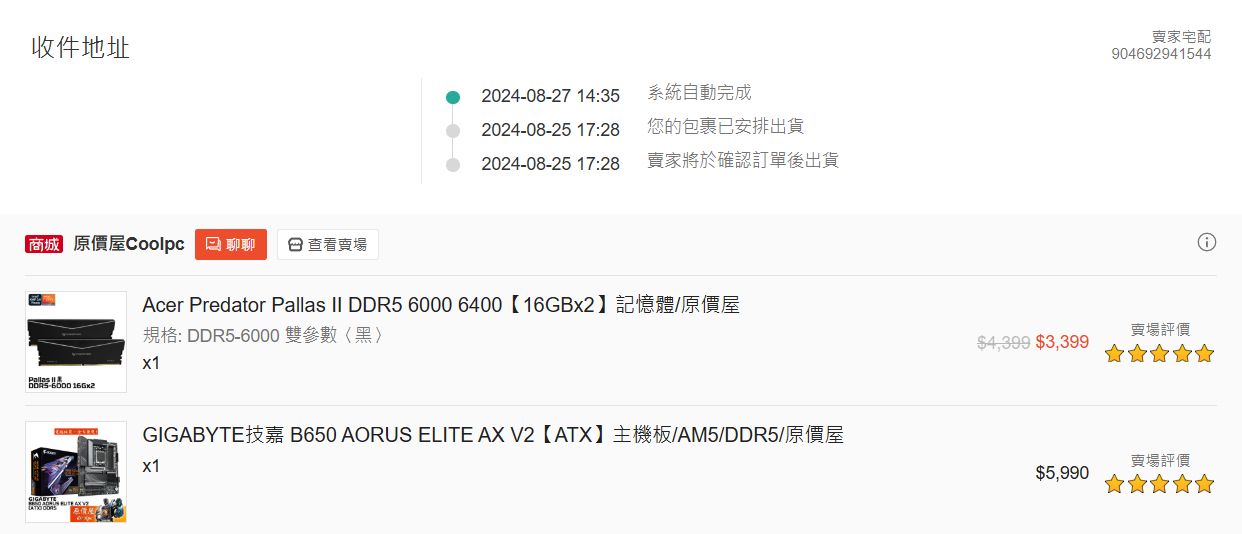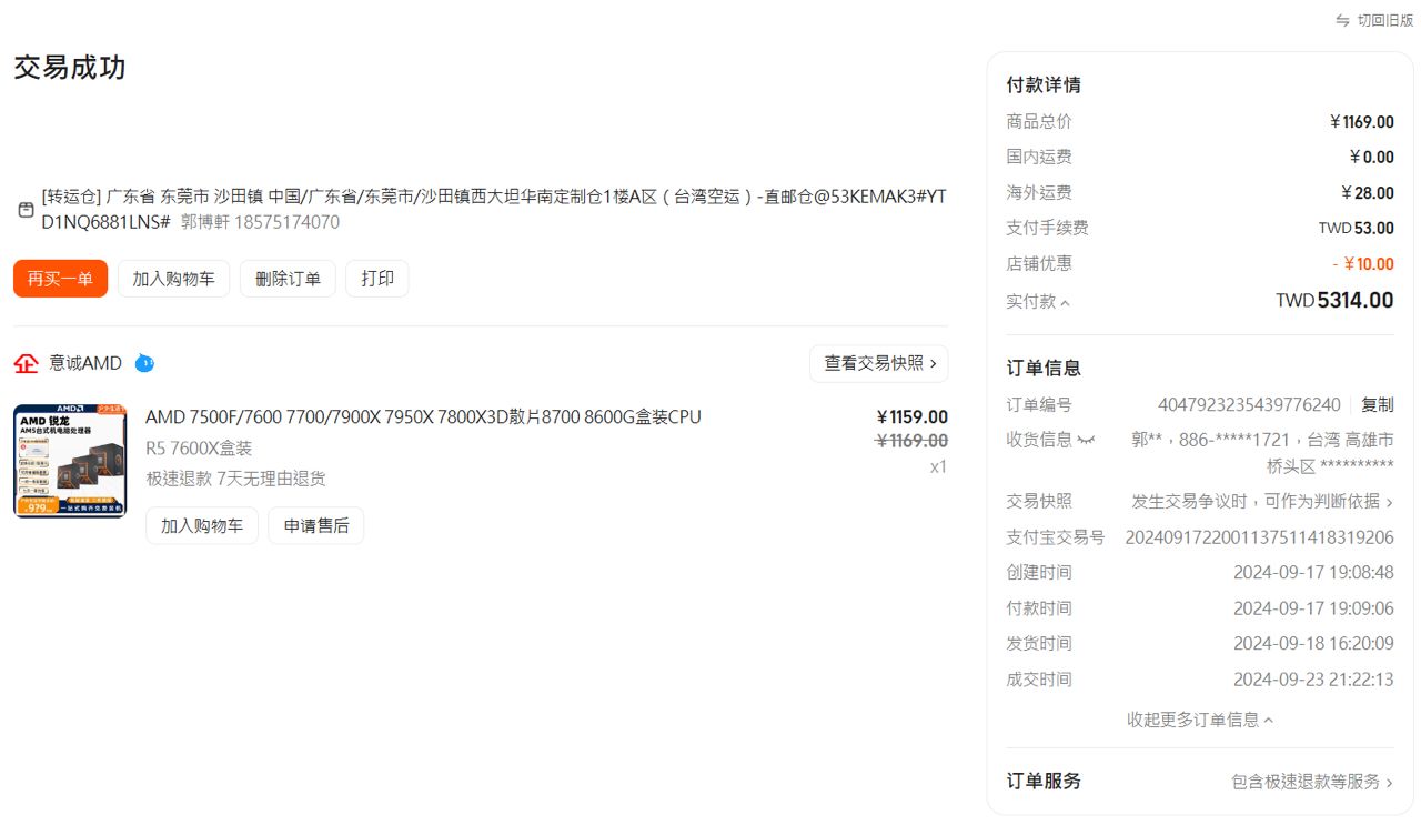 CPU:AMD 7600X 2024/9/17淘寶水貨,當無保。