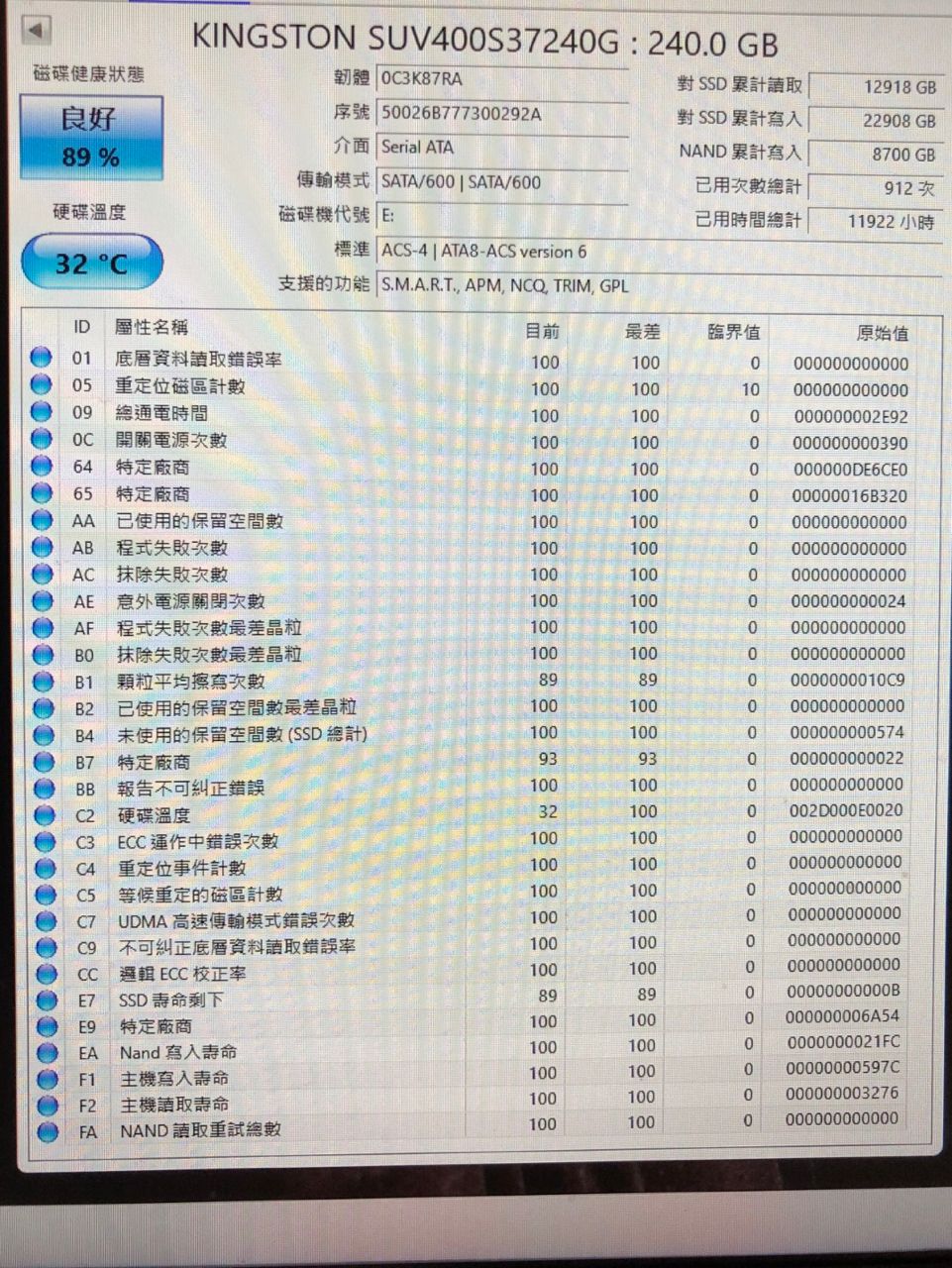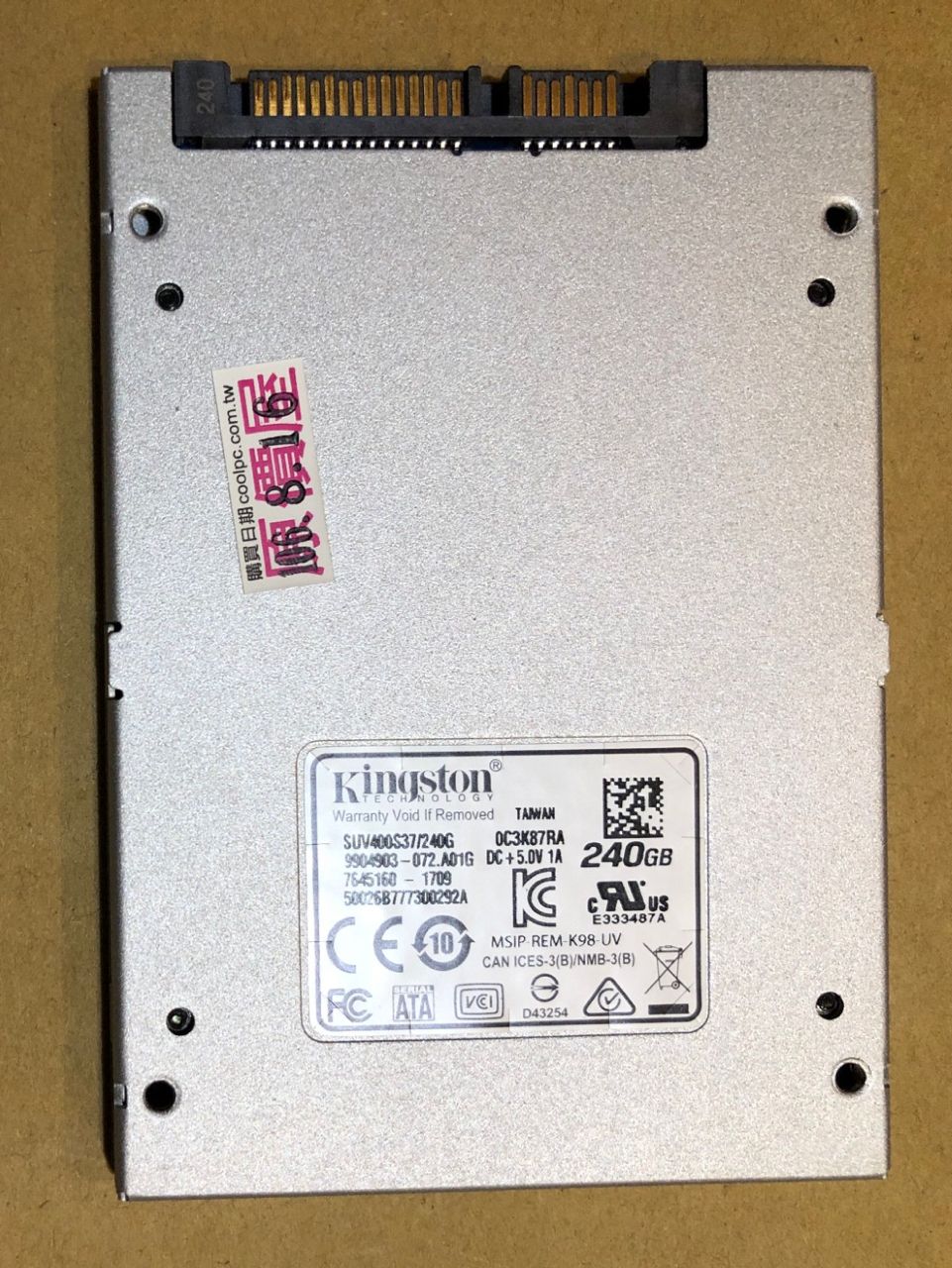 1.金士頓 SSD SUV400 240G 健康度89% $500