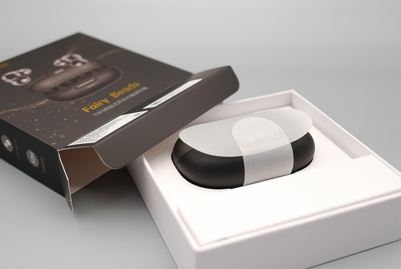 ▼ 我們先來看看外包裝,Fairy Beads 的紙盒走的是務實的黑底金字風格,翻到背面,