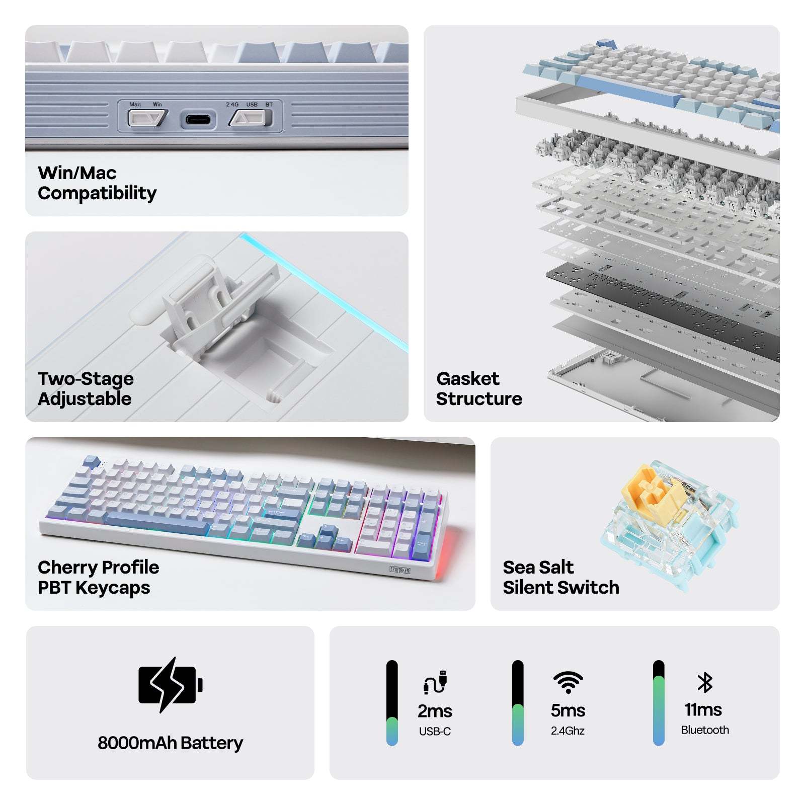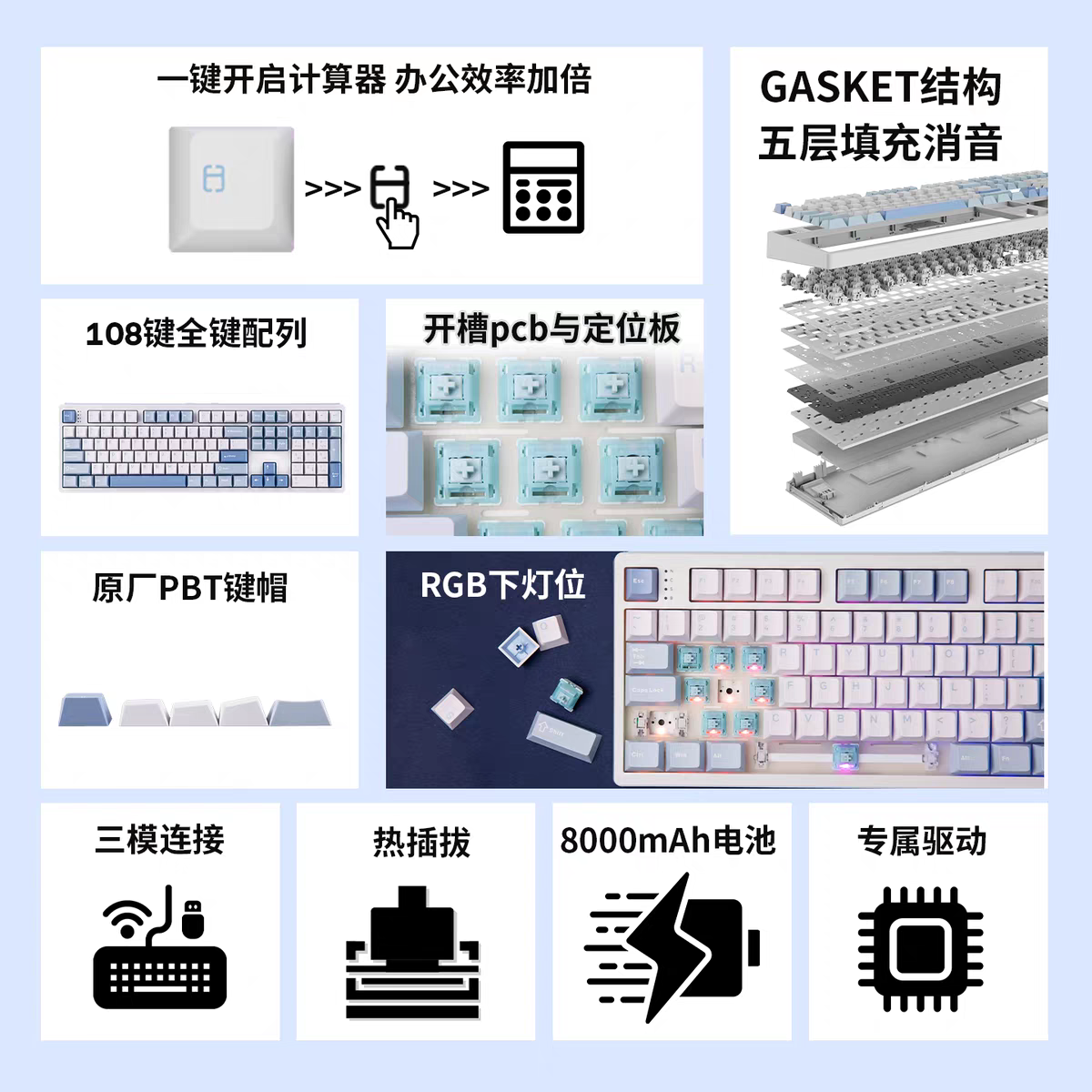常見的主流設計,GASKET 結構/五層消音填充/定位板&PCB 開槽/8000mAh