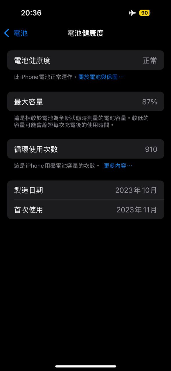 原廠電池87%(循環910次),無拆修紀錄,邊框有使用痕跡,機身正面右下角有一處小傷