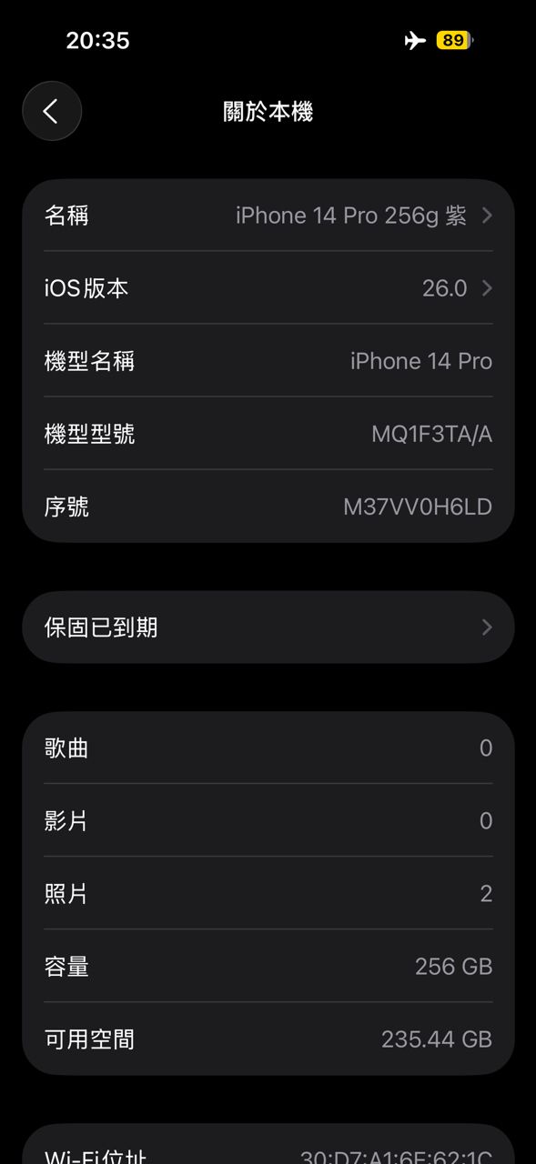 1. iPhone 14 Pro 256g 紫(iOS 26.0)