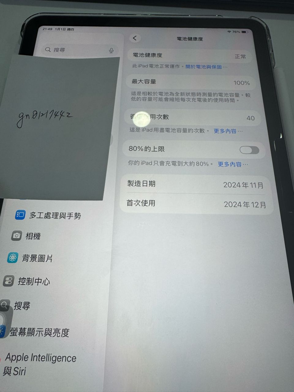 機器平時少用,全機無外傷,電池健康度100%、循環放電40次