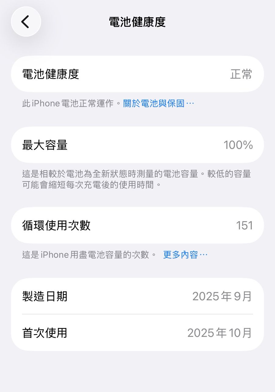 電池循環151次,健康度100%