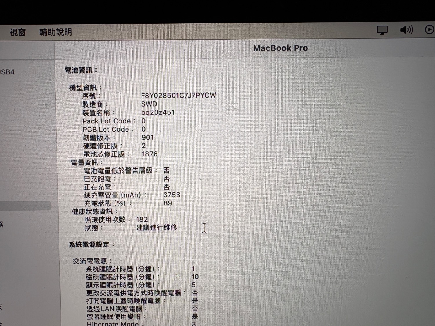 電池 循環次數 182 次,電池顯示建議維修