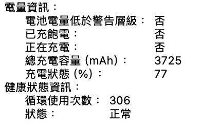 電池健康度正常,循環使用次數306次