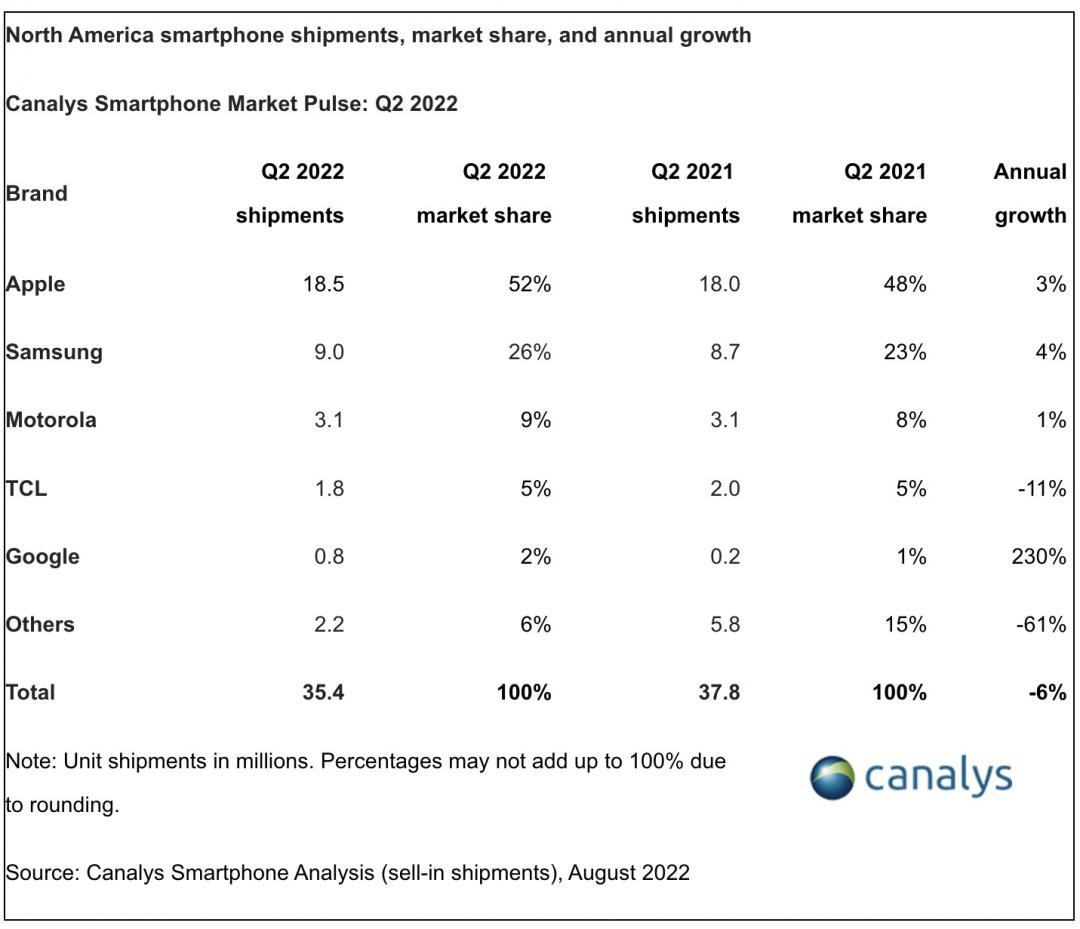 根據Canalys北美第二季銷售報告,蘋果依舊是第一大手機品牌,市占率52%,三星居次