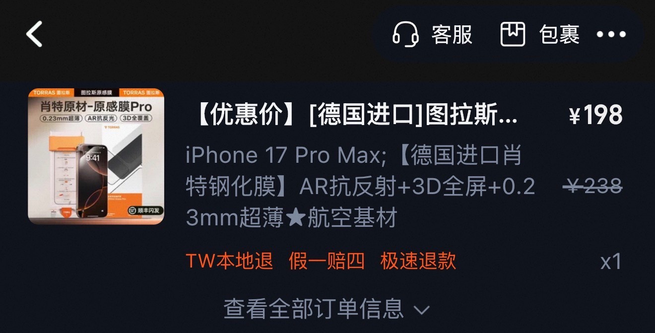 剛拿到 17 Pro,暫時用便宜款保護貼擋一下,順便當作實驗。一樣,以這個價位來說我覺得沒辦法挑剔,基本沒犯什麼錯,但機能就真的很基本(沒 AR、滑動觸控手感普通、2.5D 收邊)。