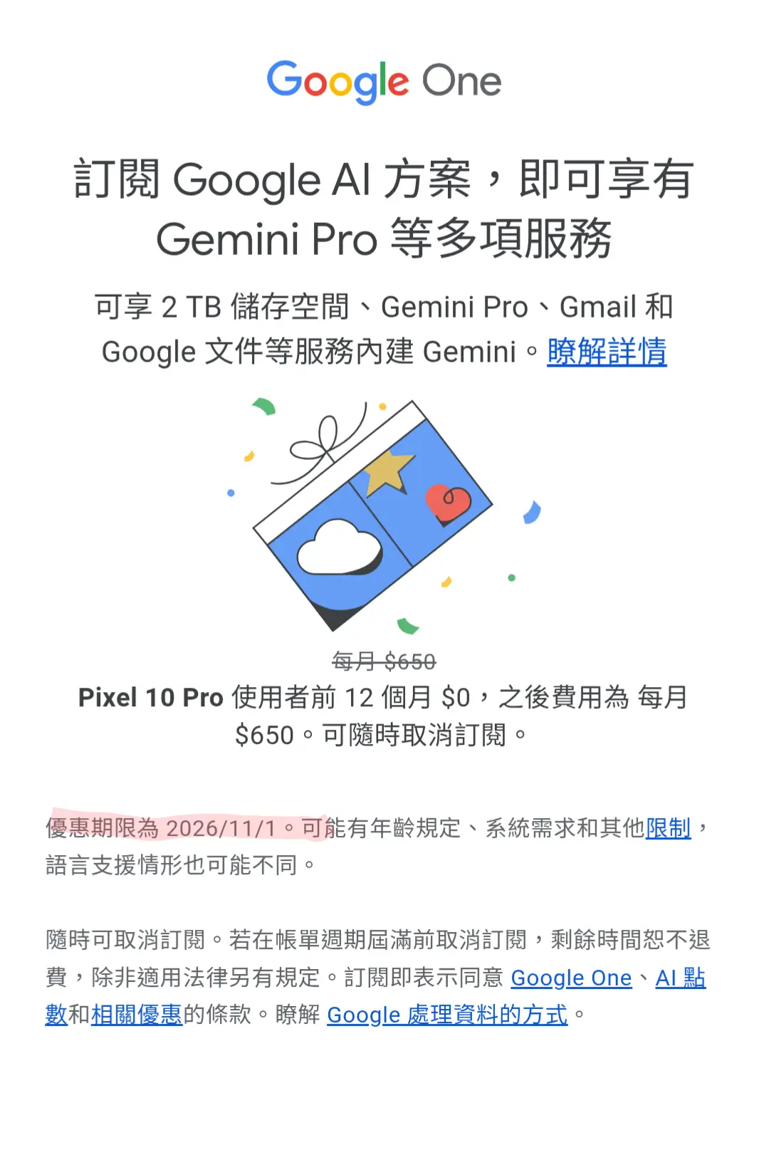 Pixel 10 pro有送Gemini AI pro一年免費