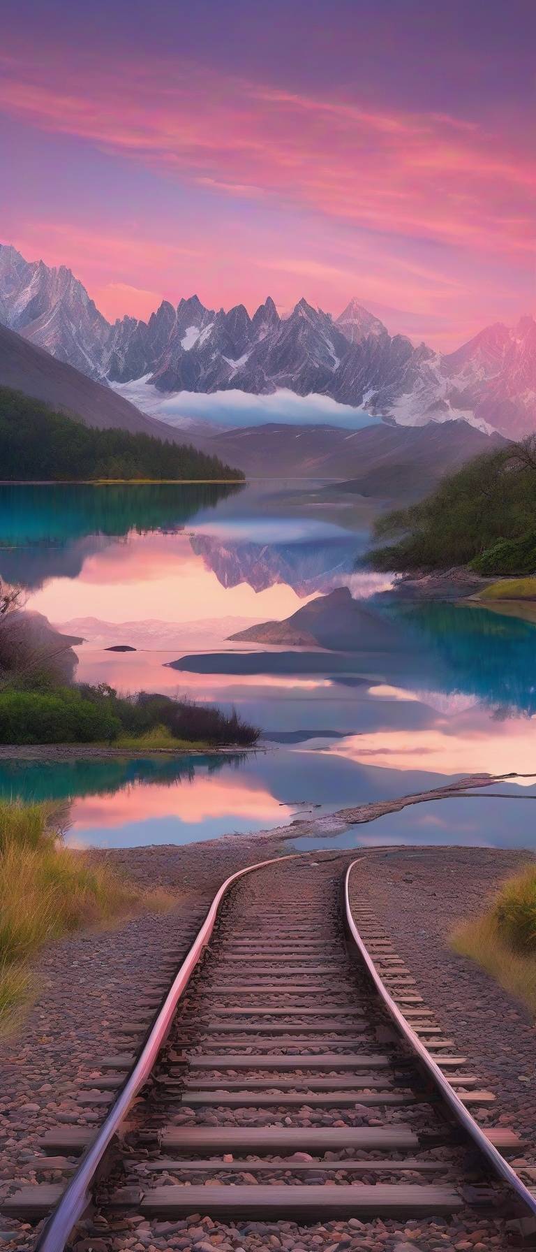 Prompt: A railway track winds its way along the shores of a serene lake, surrounded