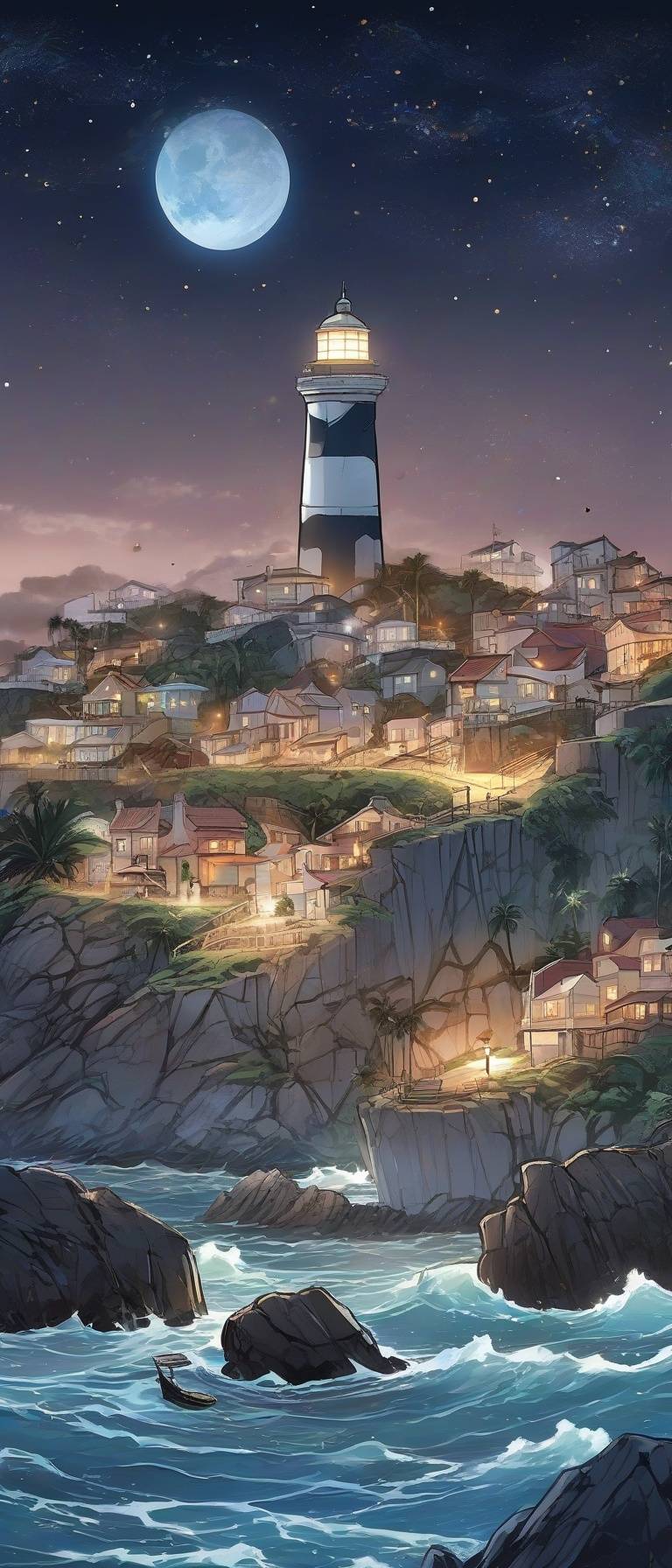 Prompt: A serene coastal city on a tropical island at night, with a crystal-clear sky