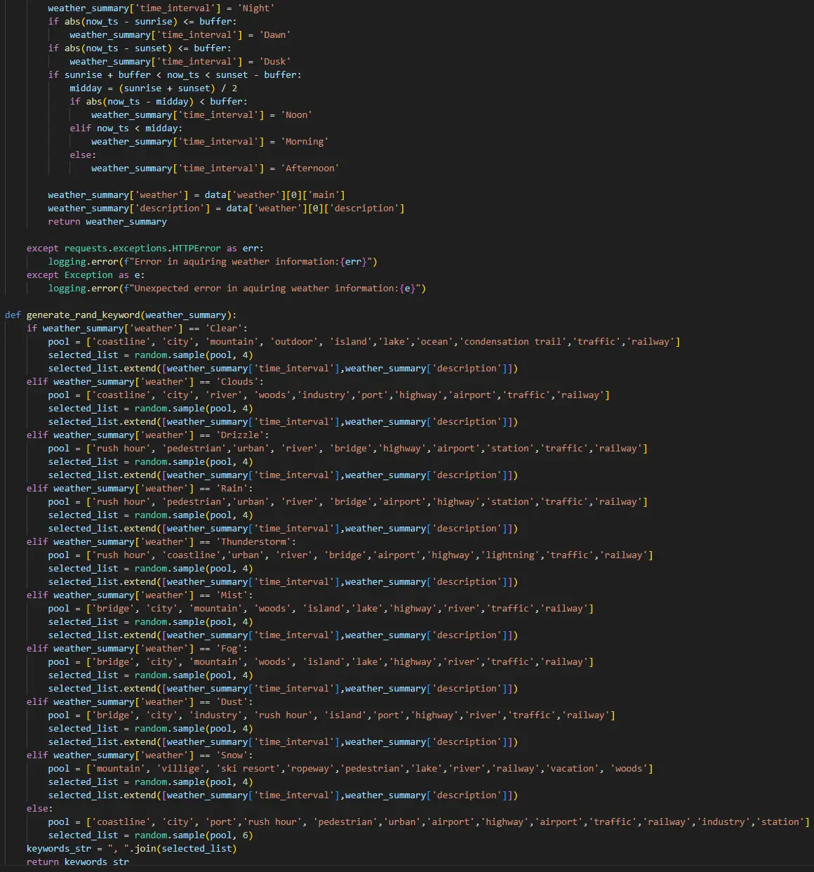然後根據不同天氣,從一大串關鍵字中選幾個,加上天氣描述和日夜描述,當作繪圖的基底