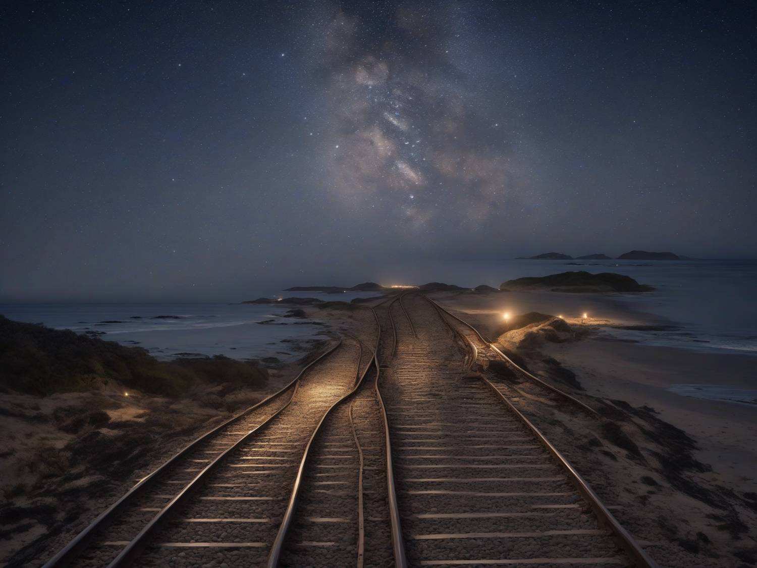 Prompt: A serene night scene of a coastal railway track overlooking the vast ocean,