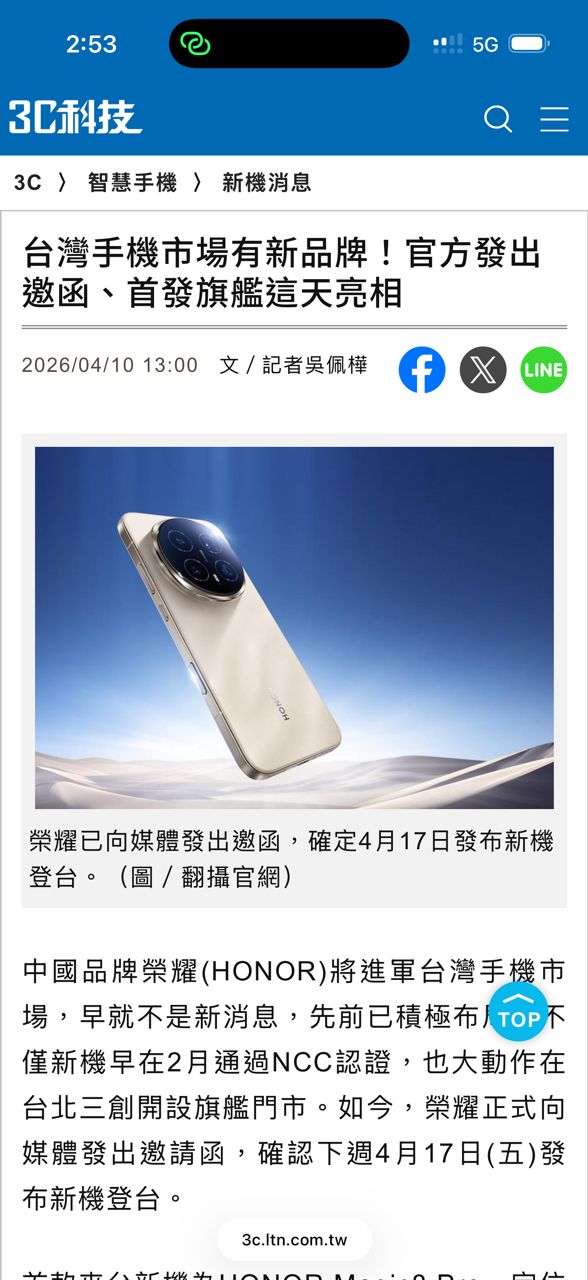 [新聞] 榮耀 HONOR 台灣確認 4/17 新機抵台