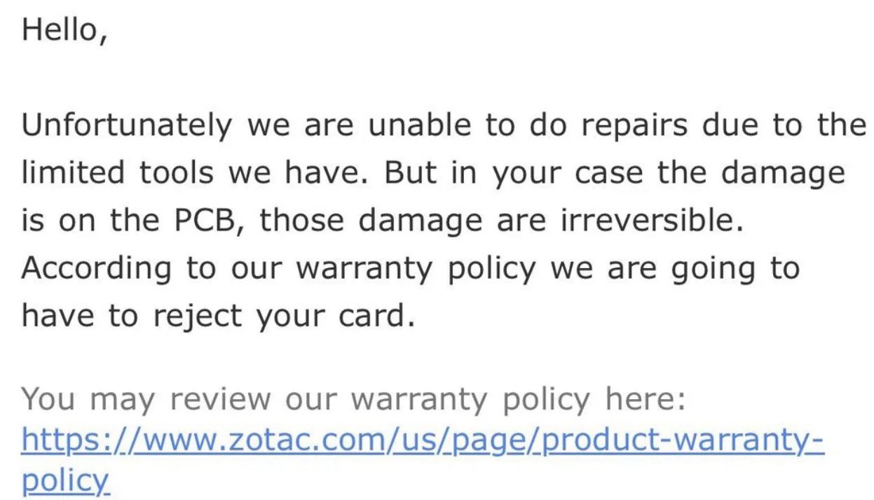 Zotac 剛剛告訴我,我的 RMA 申請被拒絕了,他們甚至連維修都不肯收費,理由是「工