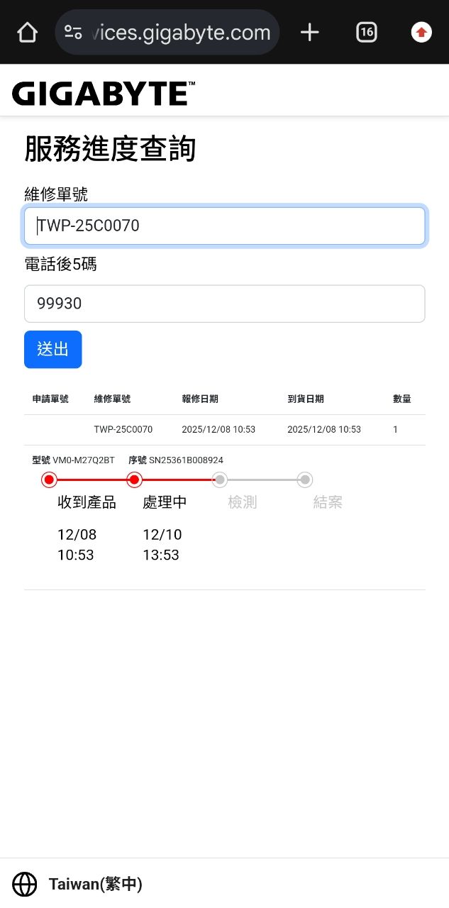 到了今天12/23,從螢幕送達到現在已經12天,即使技嘉維修服務網站寫需3~5個工作天只
