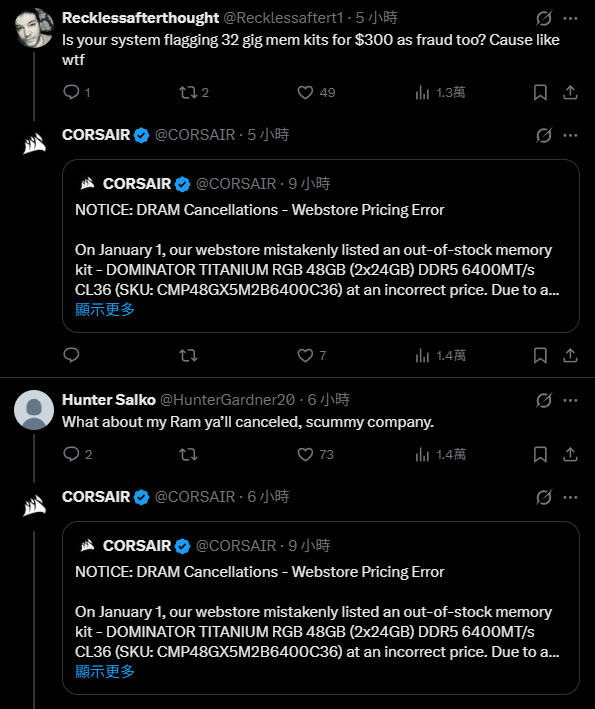1 月 1 日,我們的官方網路商店因系統錯誤,將一款實際已缺貨的記憶體套組——
