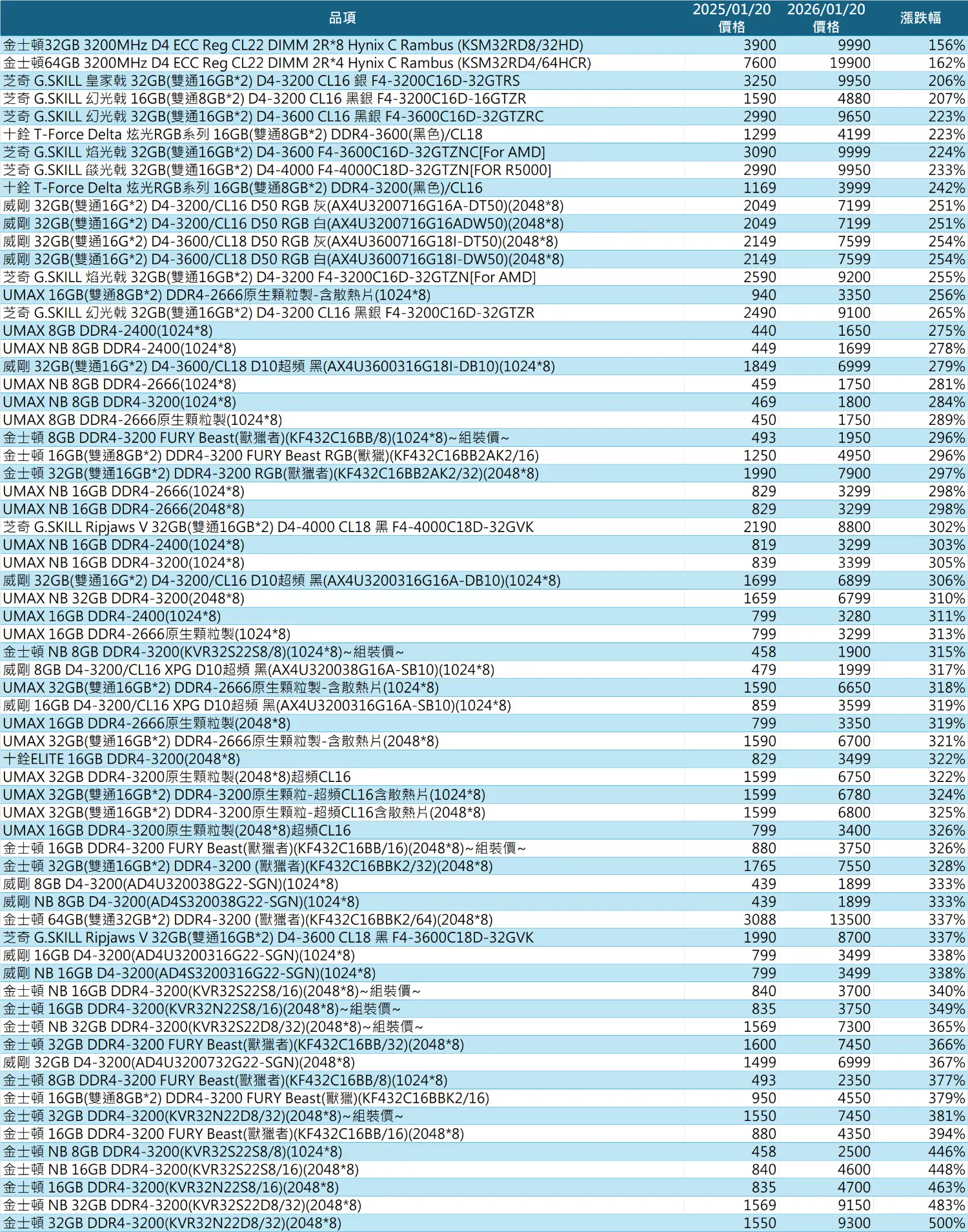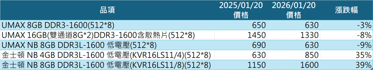 不過既然都查了,就順便比較一下2025/1/20與2026/1/20時隔一年的記憶體價格
