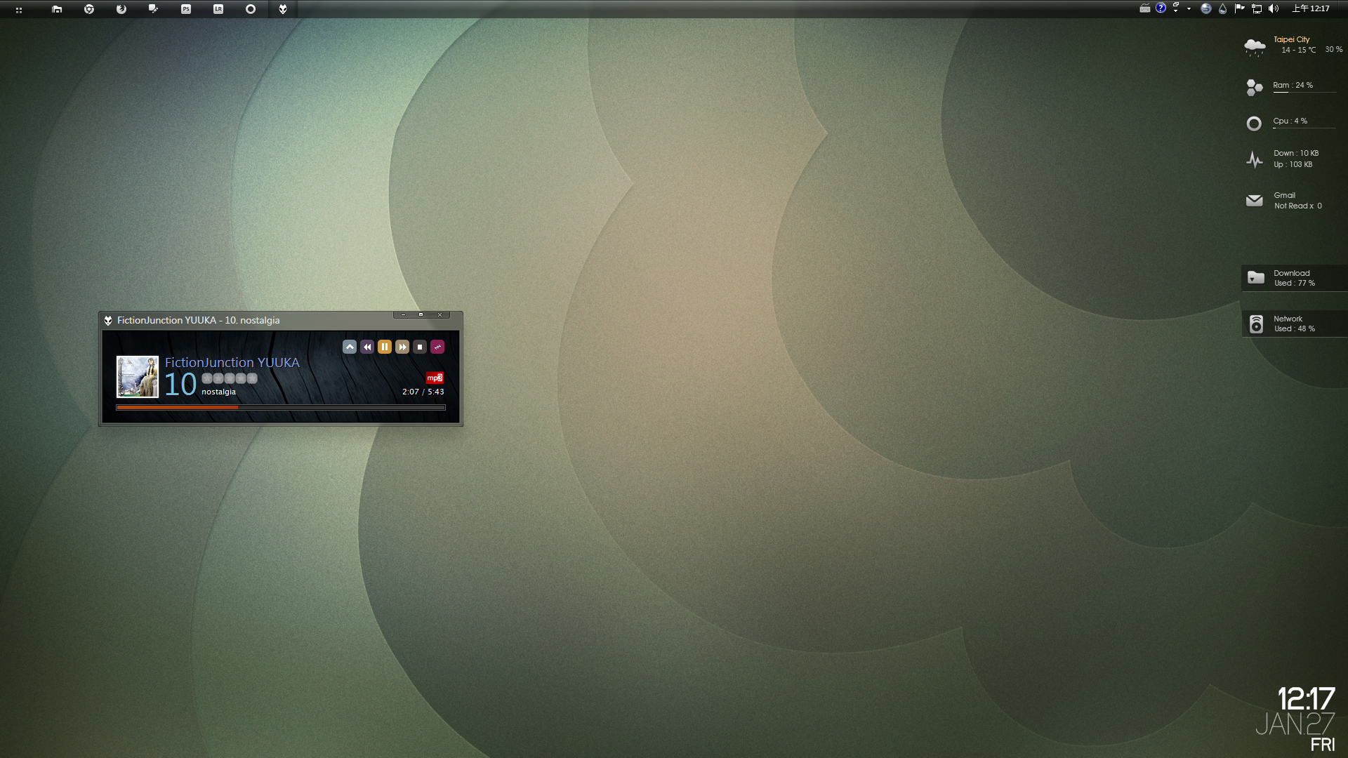 軟體為Samurize(右上角資訊) + Rainmeter (右下角時鐘)