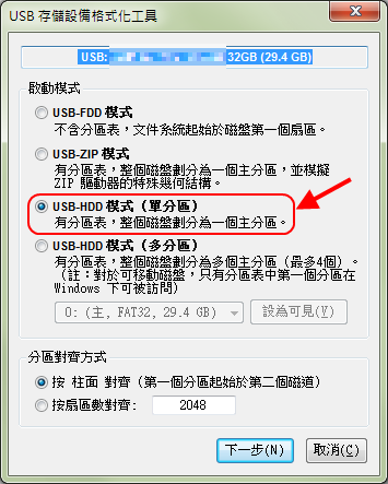 2. 如上圖所示,要選USB-HDD模式(FAT32 LBA),32G隨身碟不用