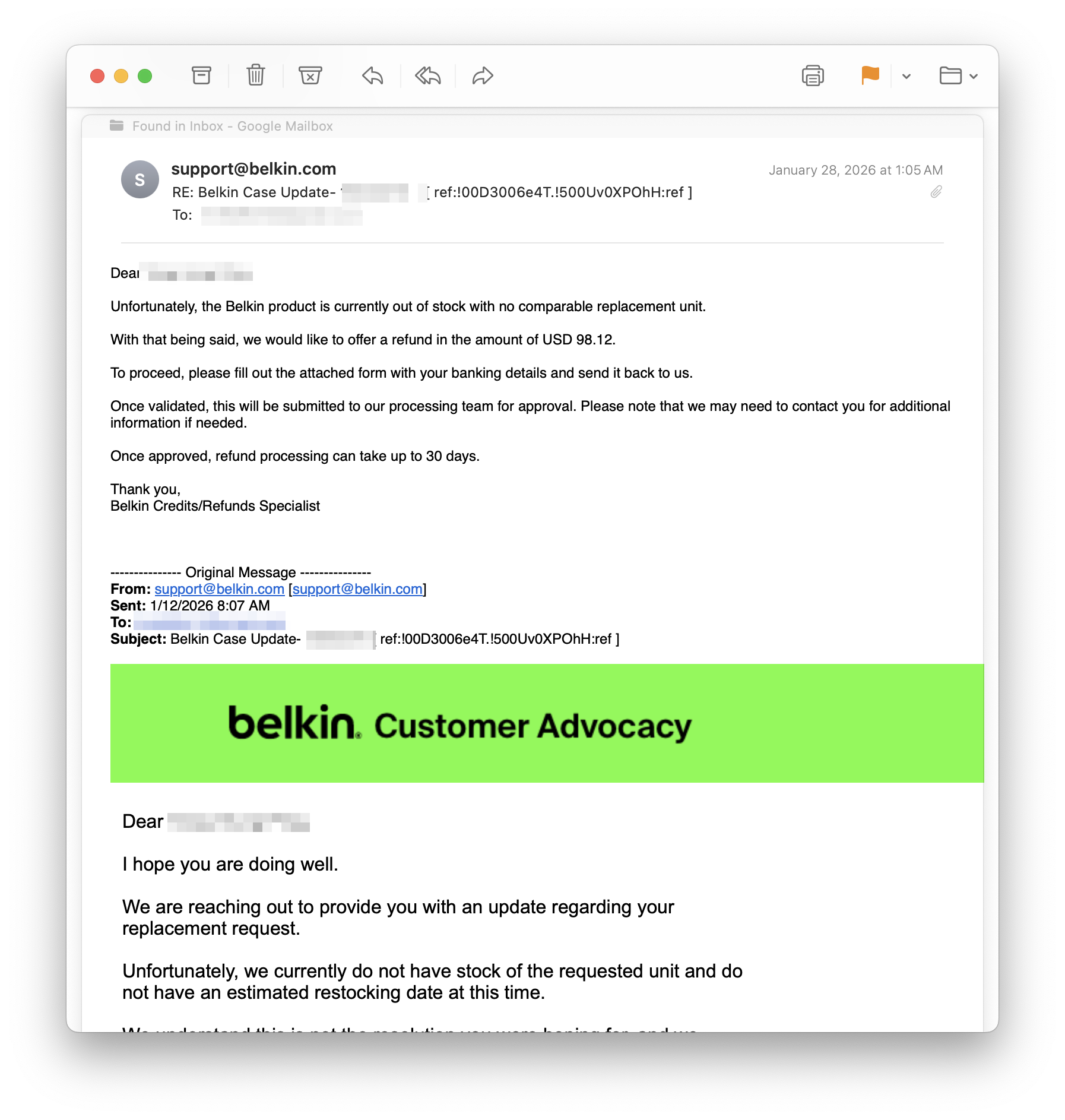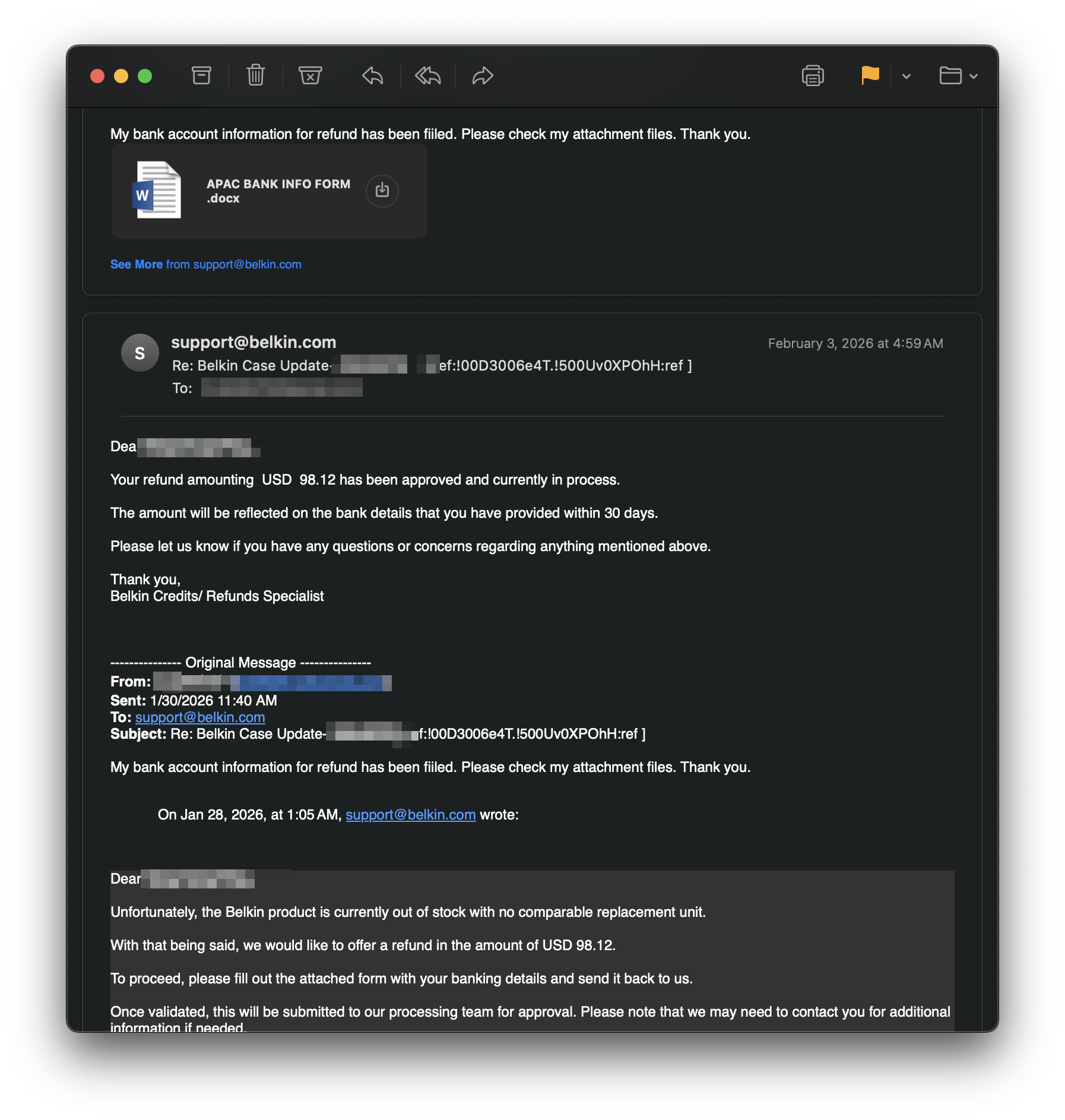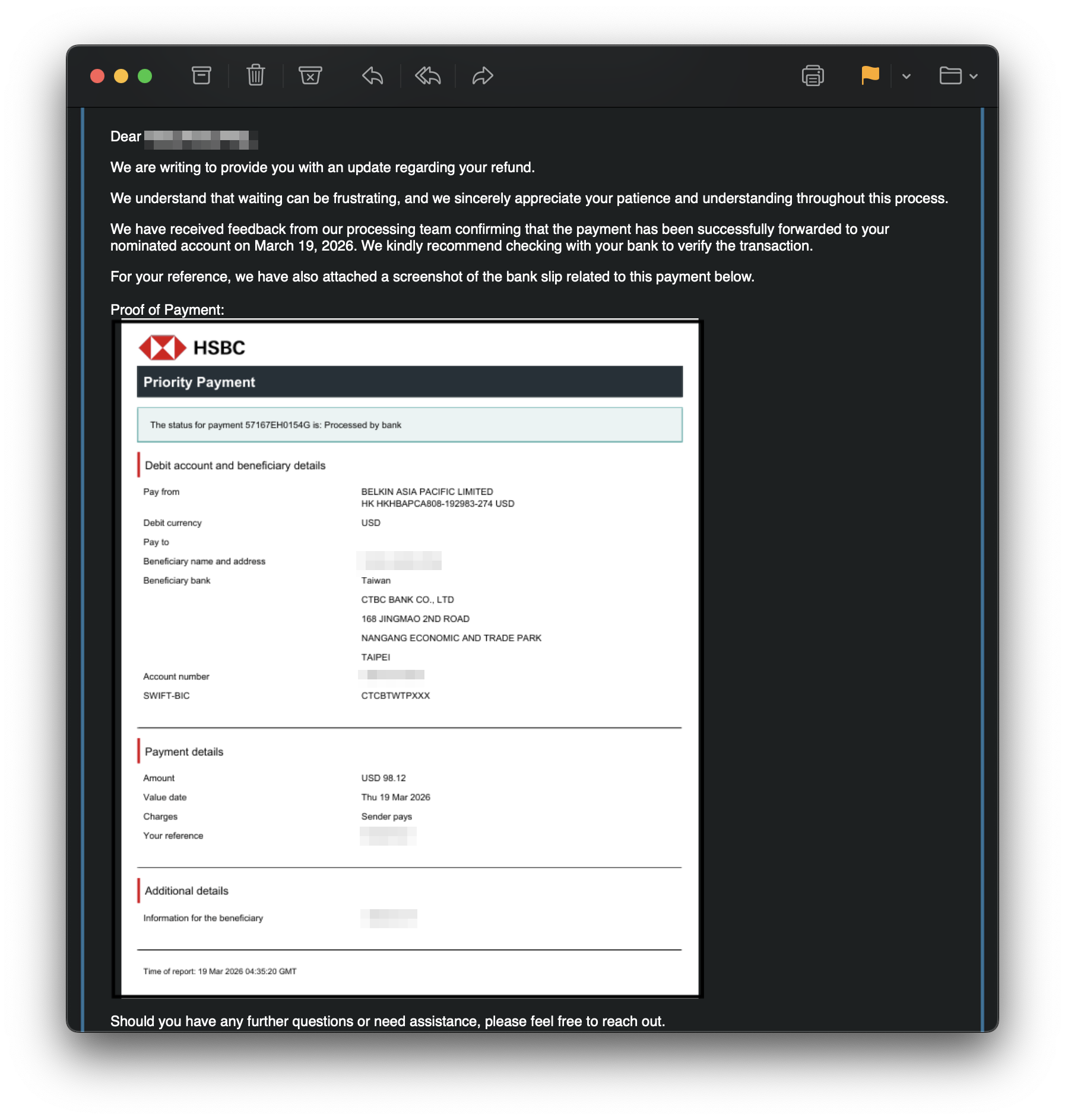 剛剛也收到Belkin提供的匯款單據,看支付方的名稱應該是香港那邊的Belkin支付,手續