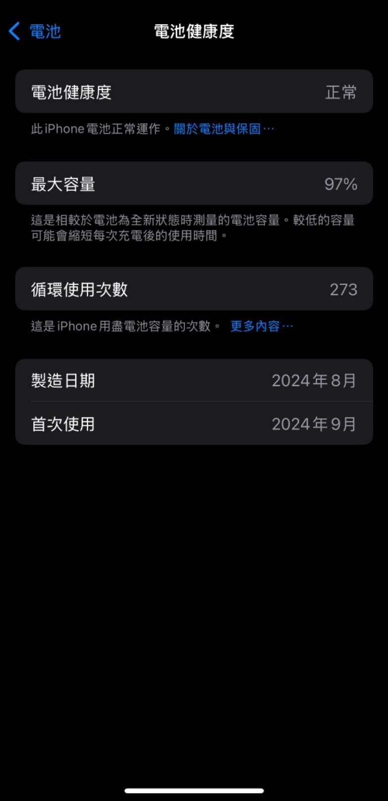 物品狀況:二手全機無損/近乎無刮傷(如實品照片)、電池健康度97%、循環273次