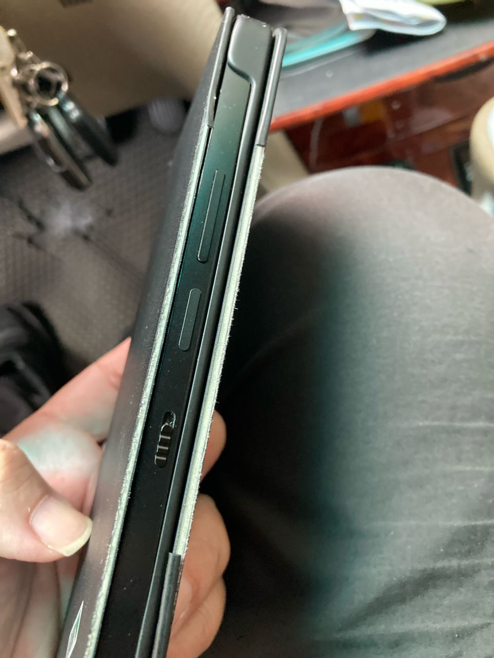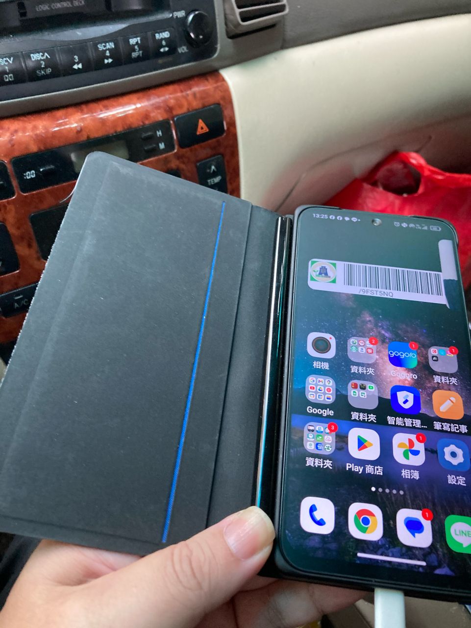 盒裝內含:充電器、保護殼、磁性皮套(邊緣脫線)、筆