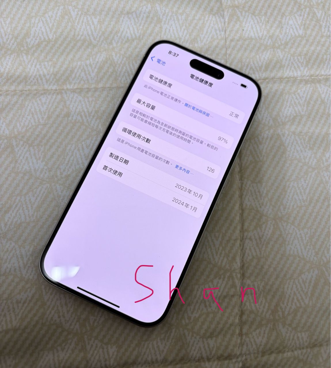 物品狀況:電池健康度97%(女用機,僅拍照用,日常使用其他手機,近全新,無刮痕無