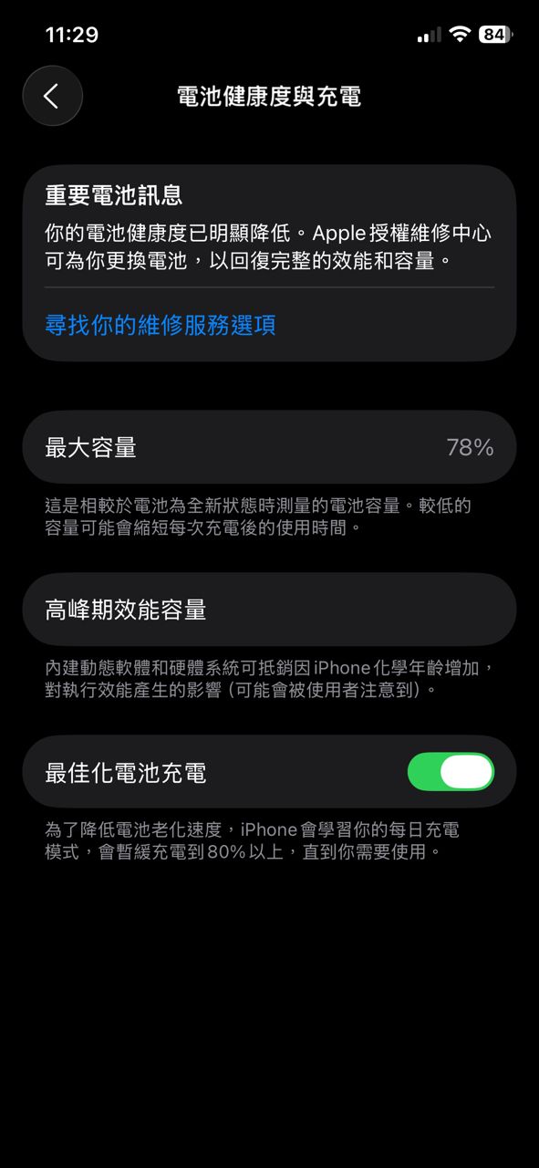 1.電池健康度:78%,電池無更換