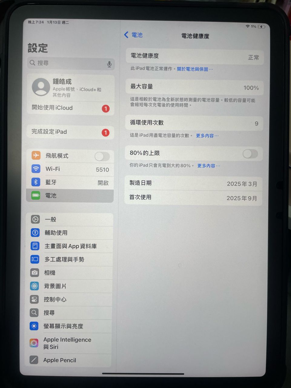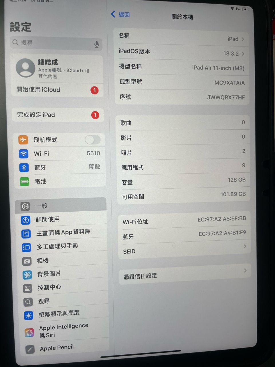 欲售物品:iPad air 11 M3 128G 藍色