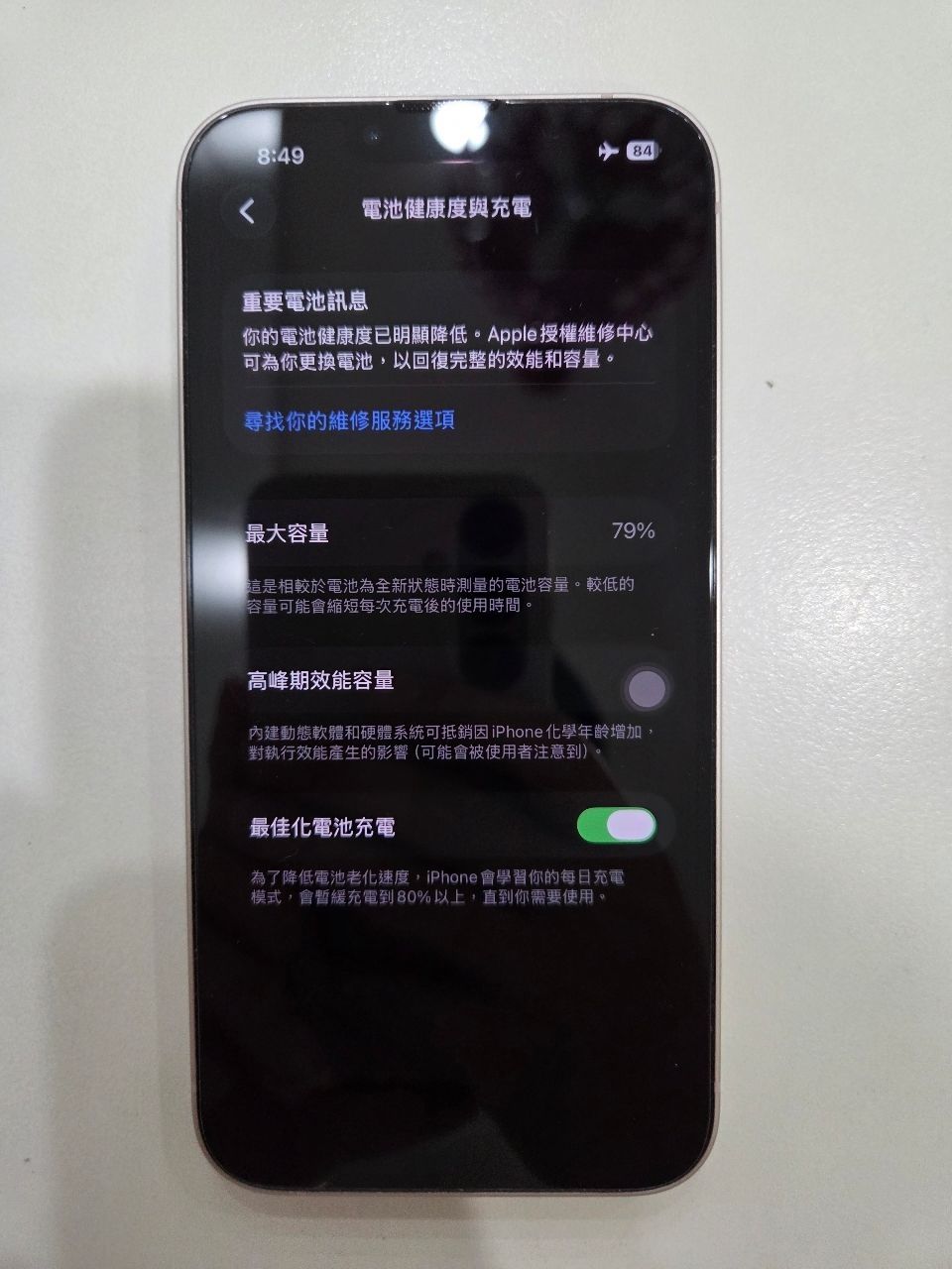 電池健康度為79%。因老婆更換新機而出售。外觀無任何損傷,且無維修紀錄。在使用期