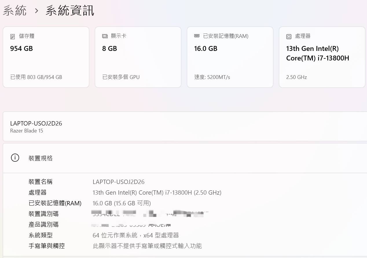 處理器□□ Intel(R) Core(TM) i7-13800H CPU @ 5.2GHz