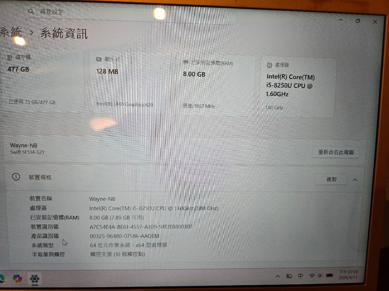 ◎筆電型號 SF514-52T-51AA 玫瑰金